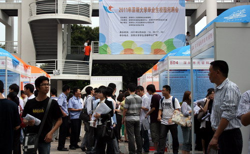 5月26日,2011屆深圳院校畢業生校園招聘會在我校學生活動中心廣場舉行。這次招聘會由深圳市人力資源和社會保障局主辦,深圳市勞動就業服務中心、深圳大學招生就業辦公室承辦,深圳市人才交流服務中心有限公司等承辦,以“放飛青春夢,傳遞就業關懷”為口號,共有90余家用人單位參加,提供需求崗位約2000個。 招聘會現場反響熱烈,不少同學在烈日下排起了長隊。深圳福田銀座村鎮銀行、深圳市綠色天使文化藝...