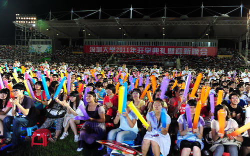 金秋九月,惠風和暢,荔園添新,歡聚一堂。9月14日晚,深圳大學田徑場燈光閃耀,掌聲雷動,我校2011年開學典禮暨迎新晚會在這里隆重舉行。伴著激揚的旋律,第二十六屆世界大學生夏季運動會開幕式“深大元素”再次精彩亮相,標兵、旗手、執旗手立于場內兩側揮舞雙臂,盡情鼓掌。90名開幕式“鮮花少女”在舞臺上踏著燈光,舞動 《鮮花禮贊》,謳歌生命,贊美青春,引起了新生們的陣陣喝彩。校領導江潭瑜、章必功、陶一桃、阮雙琛、邢鋒、李永華,中國工程院院士牛憨笨、中國科學院院士倪嘉纘,各學院、各機關單位、教研教輔單位的負責人,學生家長代表及2011級全體新生出席典禮。