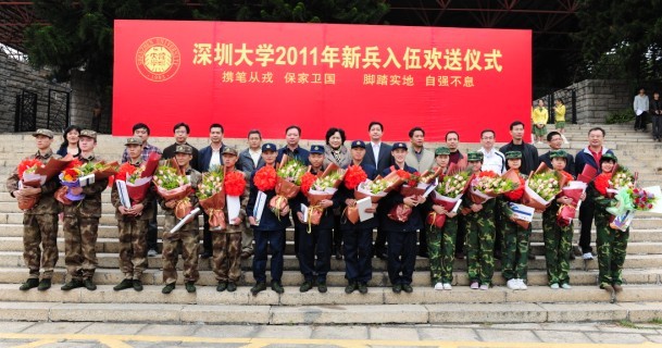“攜筆從戎,保家衛國,腳踏實地,自強不息”。12月9日上午,我校2011年入伍學生歡送儀式在演會中心前舉行。校黨委副書記陶一桃、副校長李永華以及武裝部、各學院領導、新兵家長代表及學院師生代表出席歡送儀式。 我校征兵工作有著優良傳統,前不久我校分別被評為南山區和深圳市2010年冬季征兵工作先進單位。今年我校冬季征兵從10月20日開始啟動,得到了全校師生的廣泛關注和大力支持。同學們積極響應祖國號召,...