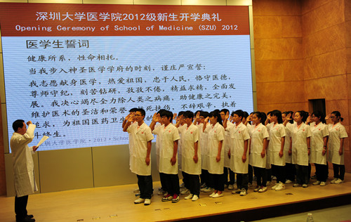 9月18日下午,我校醫學院2012級新生開學典禮在醫學院報告廳舉行。中國工程院院士、深圳大學醫學院名譽院長、醫學院學術委員會主任鐘南山,我校醫學院學術委員會常務副主任陳思平,深圳市衛生和人口計劃生育委員會主任、深圳大學醫學院學術委員會委員江捍平,深圳市第二人民醫院、深圳大學第一附屬醫院院長蔡志明,深圳市羅湖醫院、深圳大學附屬羅湖醫院院長葉平,深圳市瀚宇藥業有限公司董事長曾少貴,深圳市安保科技有限公司總經理王雙衛,深圳市邁科龍電子有限公司總裁代表劉文琴,醫學院院長姜文奇、黨委書記謝苗和部分學生家長、各兄弟單位的領導、專家以及附屬醫院、醫學院教師代表和醫學院2012級全體碩士研究生和本科新生出席了典禮。開學典禮由謝苗主持。