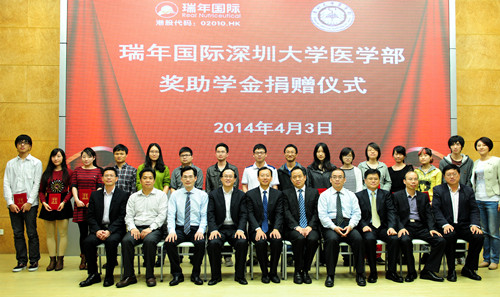 4月3日下午,瑞年集團深圳大學醫學部獎助學金捐贈儀式在我校醫學部附樓學術報告廳舉行。瑞年國際有限公司董事局主席、總裁王福才,北京大學醫學部投資管理有限公司總經理陳立奇,澳門第一大藥廠、廣州向天果公司、深圳深暉集團、深圳瑞利健科技有限公司、深圳中聯大藥房控股有限公司、瑞年大藥房等企業代表,與我校副校長李鳳亮,學生部、校教育發展基金會、醫學部的負責人及醫學部的部分教師和學生代表共同出席了捐贈儀式。本次儀...