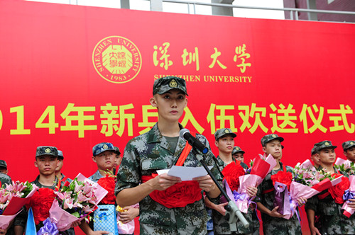 9月4日下午,我校2014年新兵入伍歡送儀式在學生活動中心舉行。校黨委副書記張基宏、副校長李鳳亮,南山區(qū)武裝部部長黃輝,校武裝部及各學院負責人、入伍新兵和學生代表參加了歡送儀式。 歡送儀式上,校武裝部負責人介紹了來自各個學院的新兵代表。截至日前,今年我校共有43名學生應征入伍,為歷年來人數(shù)最多的一年。他們將奔赴新疆軍區(qū)、南京軍區(qū)、廣州軍區(qū)、...
