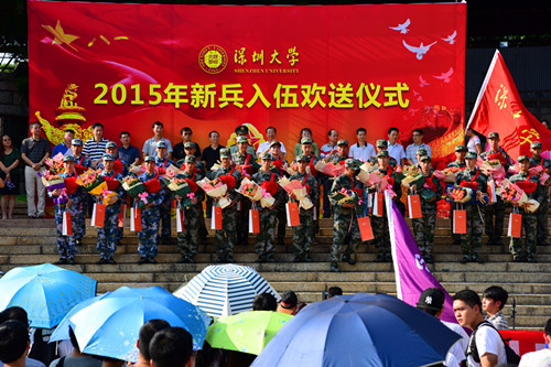 9月8日下午,在我校演會中心門口舉行2015年新兵入伍歡送儀式。副校長李鳳亮,南山區區委常委、區武裝部政委余富榮上校,武裝部、應征入伍學生所在學院的領導,學生部、各學院學生代表,2015年退役老兵,新兵親屬參加歡送儀式。 經過層層嚴格選拔,我校光電學院孫冊等26名同學脫穎而出,光榮加入中國人民解放軍。 在歡送儀式上,李鳳...