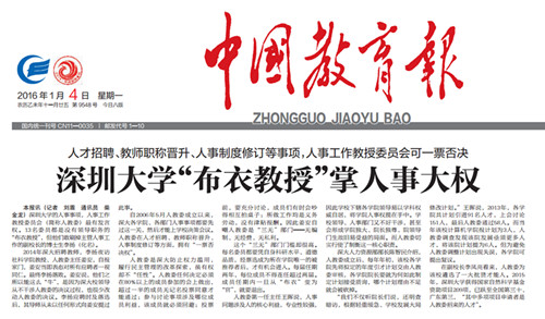 《中國教育報》2016年1月4日頭版頭條報道我校“布衣教授”掌人事大權。全文如下: 深圳大學的人事事項,人事工作教授委員會(簡稱人教委)最有發言權。13名委員都是沒有領導職務的“布衣教授”,但他們敢刷掉主管人事工作的副校長的博士生李揚(化名)。 2014年深大招聘教師,李揚夜訪社科學院教授、人教委主任姜安,自報家門,姜安當即表態對所有應聘者一視同仁。最終李揚落敗。姜安說,他們之所...