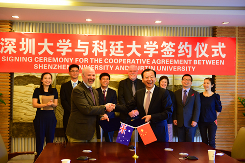 6月3日下午,我校與澳大利亞科廷大學在辦公樓301舉行合作簽約儀式。科廷大學副校長Seth Kunin、Steve Mickler,媒介、文化與創意藝術學院院長Michele Willson,我校副校長李鳳亮,國際交流與合作部、研究生院、文化產業研究院等部門相關負責人參加儀式。 李鳳亮對科廷大學副校長一行的到來表示歡迎。他介紹說,文化創意產業在深圳市蓬勃發展,在過去的一年,文化創意產業的經濟規模占到了全市全年GDP總量的百分之十。目前深圳大...