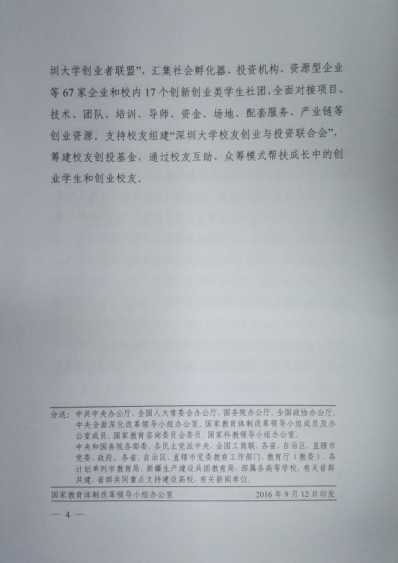 近日,國家教育體制改革領導小組辦公室以《深圳大學:推動創新創業教育“五個轉變”》為題,單篇推介了深圳大學創新創業教育改革經驗和作法,并經中央有關領導簽發,以《教育體制改革簡報》形式,印發全國。 (創業學院 供稿)
