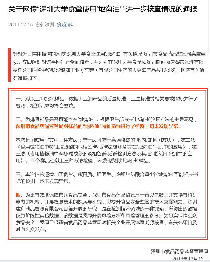 市食品藥品監督管理局通報網傳深圳大學食堂使用“地溝油”事件核查結果