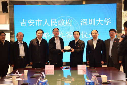 3月28日上午,吉安市政府——深圳大學戰略合作簽約儀式在我校辦公樓201舉行。吉安市委書記胡世忠、市長王少玄、副市長鄧淑斌等和我校黨委書記劉洪一、副校長徐晨出席簽約儀式。