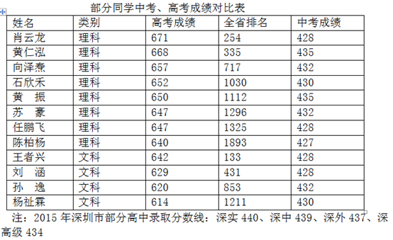 深大附中2018年高考高分率、本科率均創(chuàng)歷史新高。全部557名考生,達廣東省高分優(yōu)先投檔線率為73.1%,本科率達99.6%。 拔尖人才達到新高度。其中,600分以上47人,有望被名牌大學(xué)錄取。文科考生王者興642分,列廣東省第133名。理科考生肖云龍671分,全省第254名。音樂考生蘭甜文化成績592分,全省第5名。美術(shù)考生任雨晴文化成績576分,全省第55名。 高進優(yōu)出獲得新成效。拿云實驗班100%超高分優(yōu)先投檔線。一批中考成績列全市8000名左...