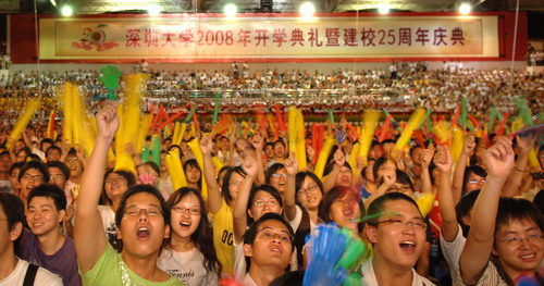 9月3日晚,田徑運動場星光燦爛,歡聲雷動,深圳大學2008年開學典禮暨建校25周年慶典在這里隆重舉行。深圳市領導李意珍、邱玫、閆小培、姜忠、陳觀光,市政府秘書長李平;校領導江潭瑜、章必功、陶士平、陶一桃、阮雙琛、邢鋒、陳思平、李永華;一批活躍在各行各業的優秀校友代表;各學院負責人及教師代表;2008級全體新生和部分學生家長共8000多人出席盛典,共賀母校華誕,共享25年光榮與喜悅。 慶典...