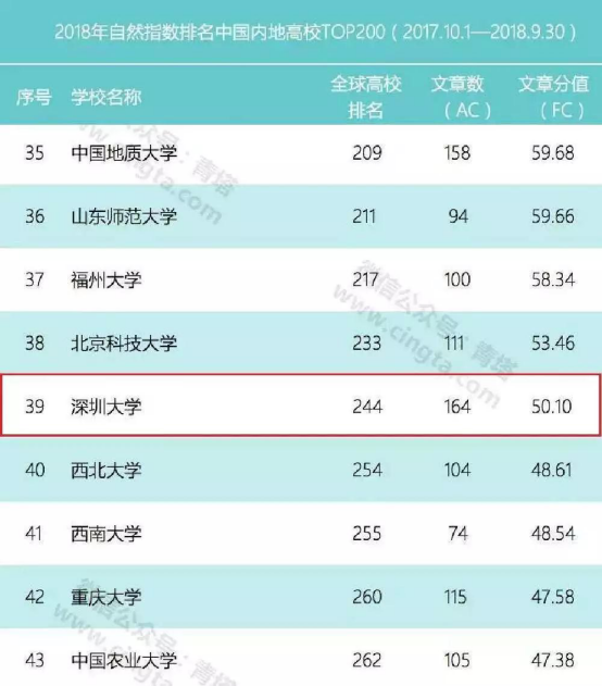 深大位列全國第39!2018年最新高校自然指數(shù)出爐
