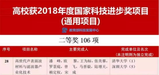 1月8日上午,2018年度國家科學技術獎勵大會在人民大會堂隆重召開,黨和國家領導人出席大會并為2018年度國家科學技術獎獲獎代表頒獎。我校羅景庭副教授參與完成的“高世代聲表面波材料與濾波器產業化技術”榮獲2018年度國家科技進步二等獎,深圳大學排名第5。 據悉,全國共有113所高等學校作為主要完成單位獲得了2018年度國家科學技術獎三大獎通用項目185項,占通用項目總數項的82.6%。全國高等學校獲得2018年國家科學技術進步獎...