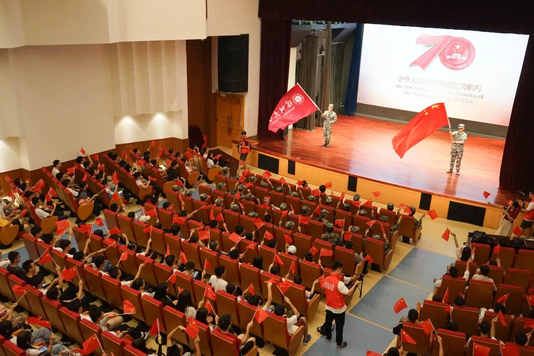 我校組織師生集中收看國慶閱兵式直播 師生揮旗合唱表白祖國