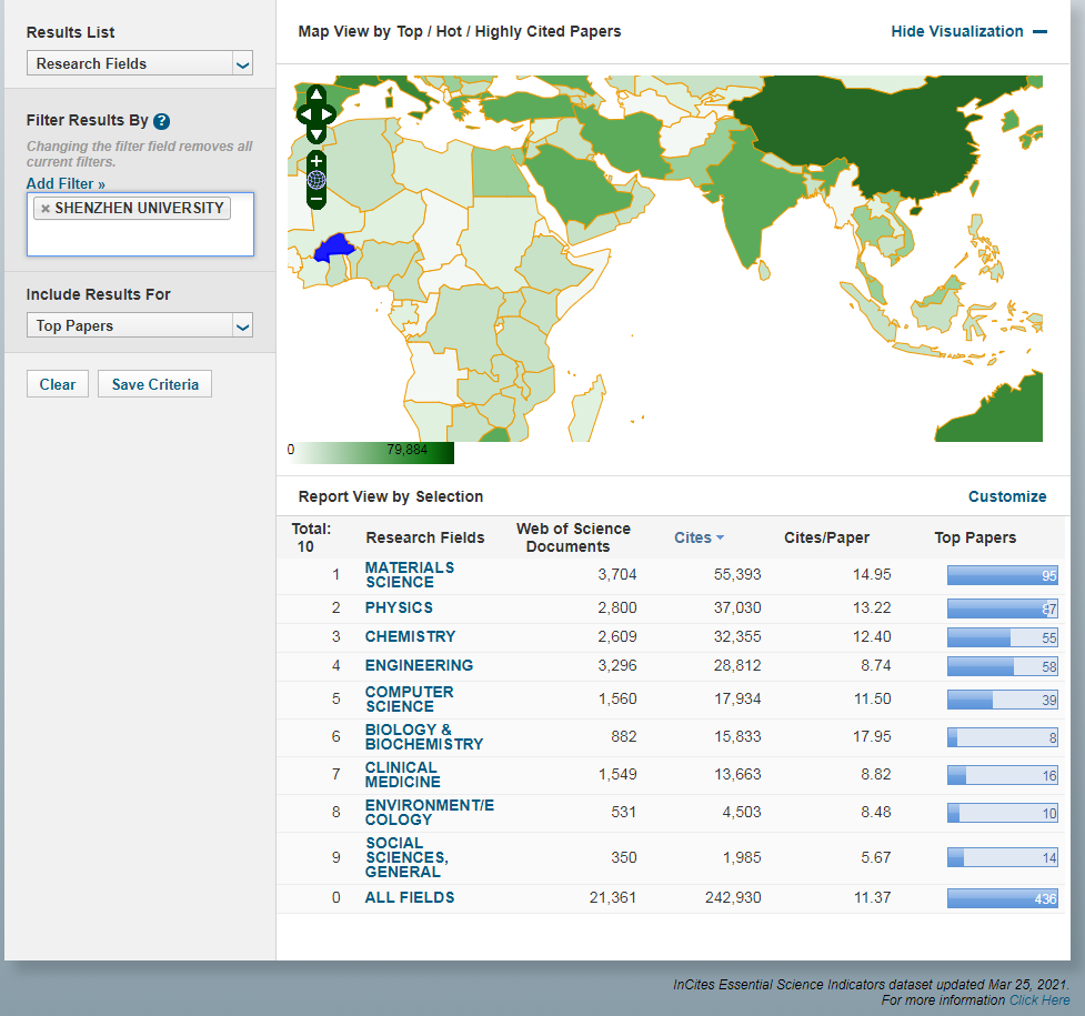 根據(jù)科睿唯安(Clarivate Analytics)2021年3月25日最新的ESI(Essential Science Indicators,基本科學(xué)指標(biāo))數(shù)據(jù)顯示,深圳大學(xué)環(huán)境科學(xué)/生態(tài)學(xué)學(xué)科首次進(jìn)入ESI世界排名前1%行列,成為我校繼工程學(xué)、臨床醫(yī)學(xué)、材料科學(xué)、生物學(xué)與生物化學(xué)、計(jì)算機(jī)科學(xué)、化學(xué)、物理學(xué)、社會(huì)科學(xué)總論之后第九個(gè)躋身ESI全球前1%的學(xué)科。本期ESI數(shù)據(jù)統(tǒng)計(jì)覆蓋時(shí)間為2010年1月1日至2020年12月31日。