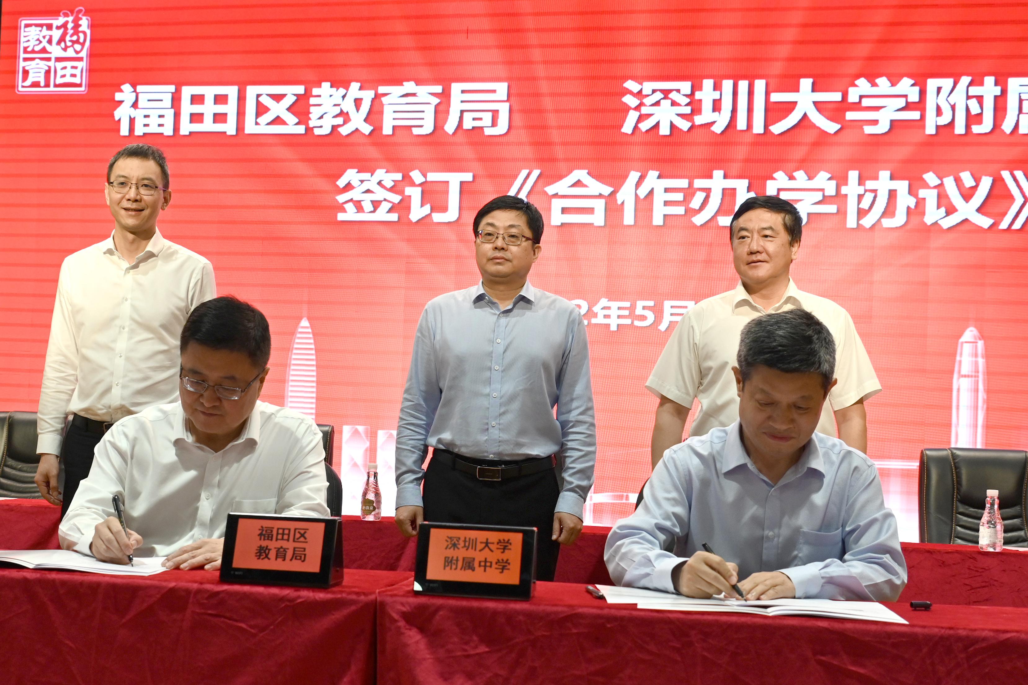 5月18日上午,深大附中與福田區教育局在北環中學簽署合作辦學協議,正式冠名北環中學為深圳市福田區深大附中創新中學(以下簡稱“深大附中福田創新中學”)。這是深大附中首次與福田教育合作辦學。 深圳大學黨委副書記范志剛,深圳市教育局黨組成員、副局長趙立,福田區政府黨組成員、副區長朱江,福田區委教育工委書記、區教育局黨組書記、局長田洪明,深圳大學附屬教育集團總校長、深大附中黨委書記、校長劉為基,深大附中福田創新中學(原北環中學)校長李國標共同出席儀式并為合作學校揭牌。田洪明主持儀式。