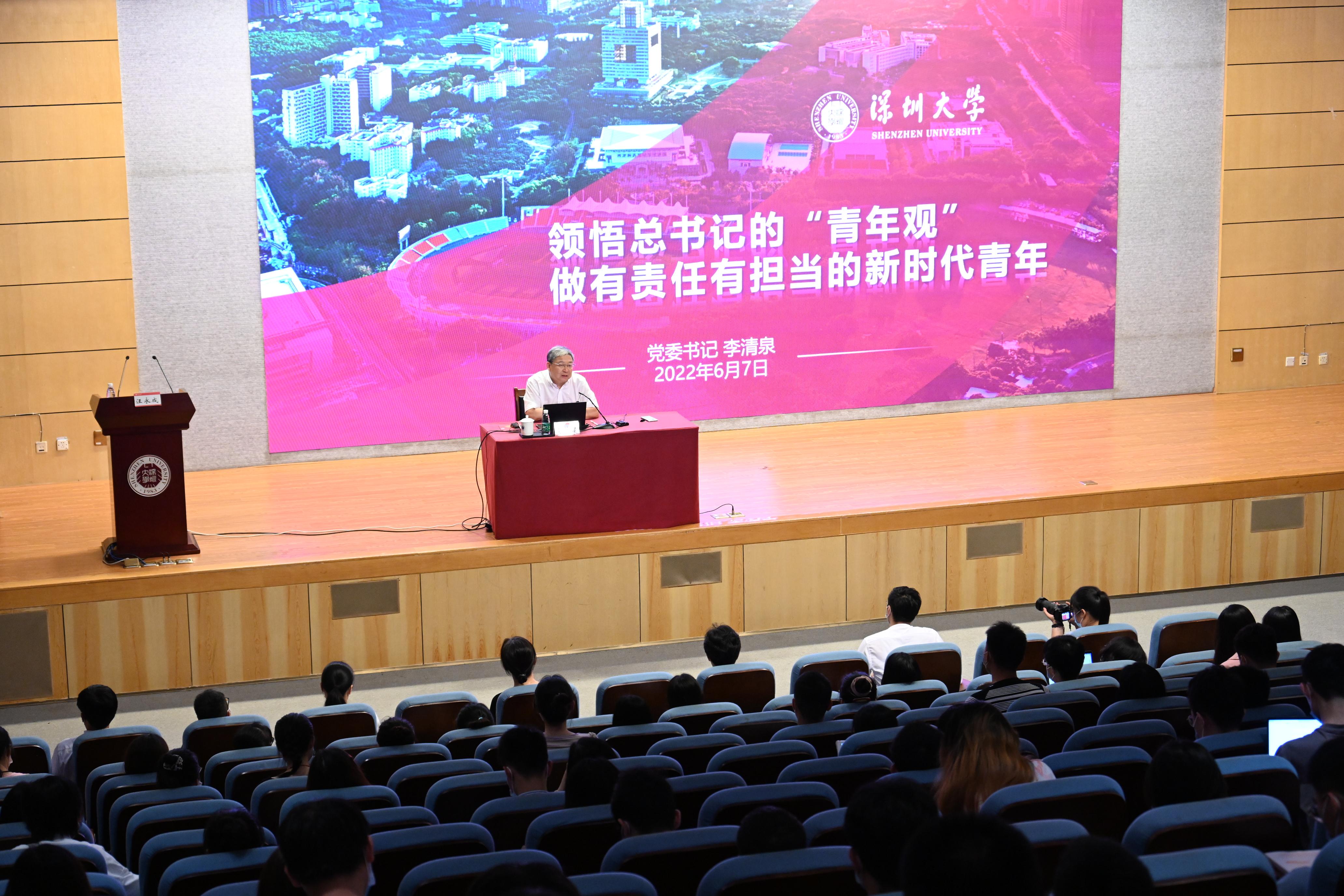 領(lǐng)悟習(xí)近平總書記“青年觀”,做有責(zé)任有擔(dān)當(dāng)?shù)男聲r代青年。6月7日下午,學(xué)校黨委書記李清泉在粵海校區(qū)匯星樓一號報告廳為師生講授了題為《領(lǐng)悟習(xí)近平總書記“青年觀”,做有責(zé)任有擔(dān)當(dāng)?shù)男聲r代青年》思政課?;浐:望惡蓚€校區(qū)的師生代表聆聽了此次講座,其中麗湖校區(qū)師生在守忠樓一樓報告廳采用線上視頻的方式同步學(xué)習(xí)。