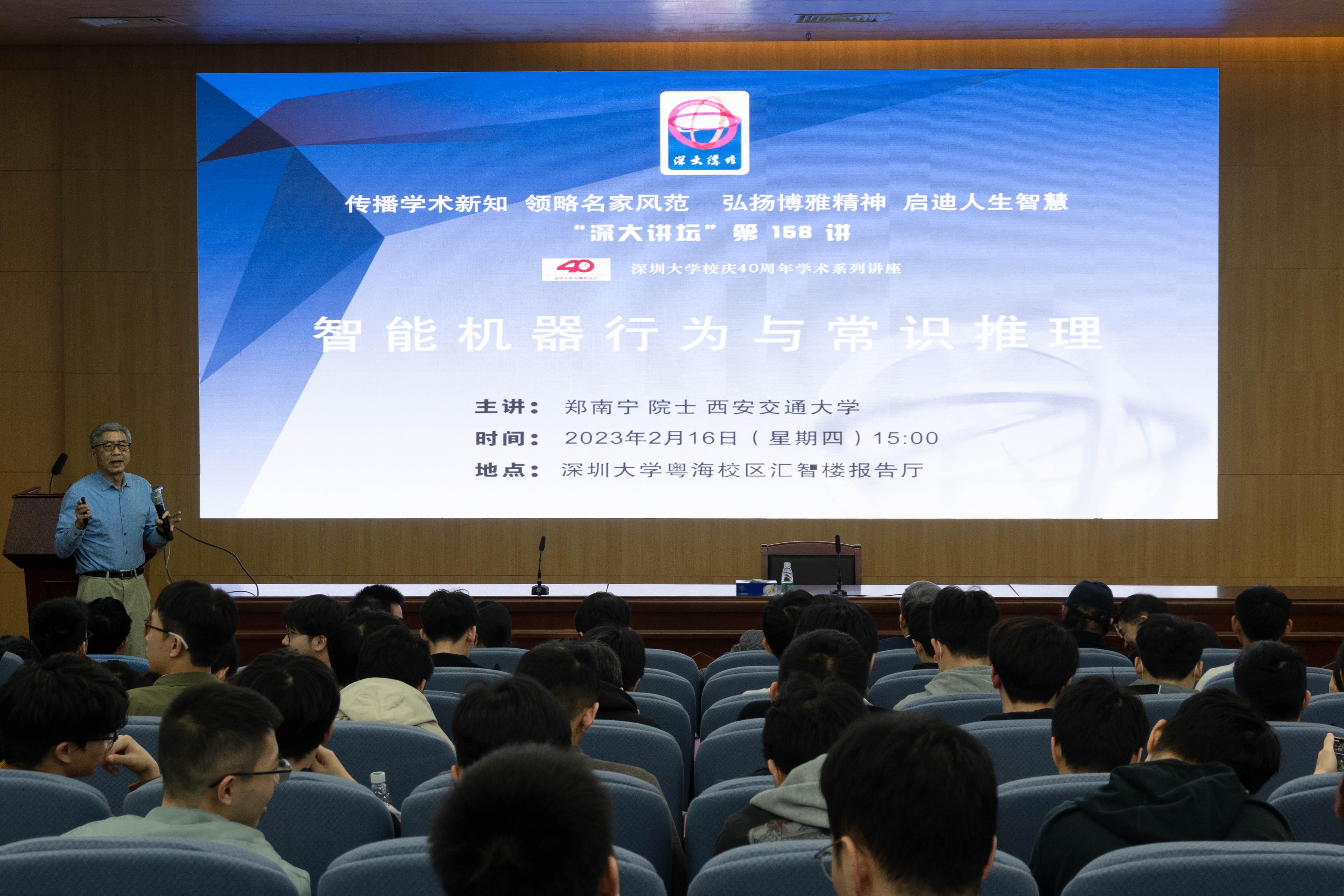 2月16日下午,深圳大學校慶40周年學術系列講座暨“深大講壇”第一百五十八講在粵海校區匯智樓報告廳開講。中國工程院院士、中國自動化學會理事長、人機混合增強智能全國重點實驗室主任、視覺信息處理與應用國家工程實驗室理事長、IEEE Fellow、西安交通大學鄭南寧教授作為主講人,為深大師生帶來了一場以“智能機器行為與常識推理”為題的精彩講座。深圳大學黨委書記李清泉,機電與控制工程學院相關負責人及百余師生聆聽了講座。