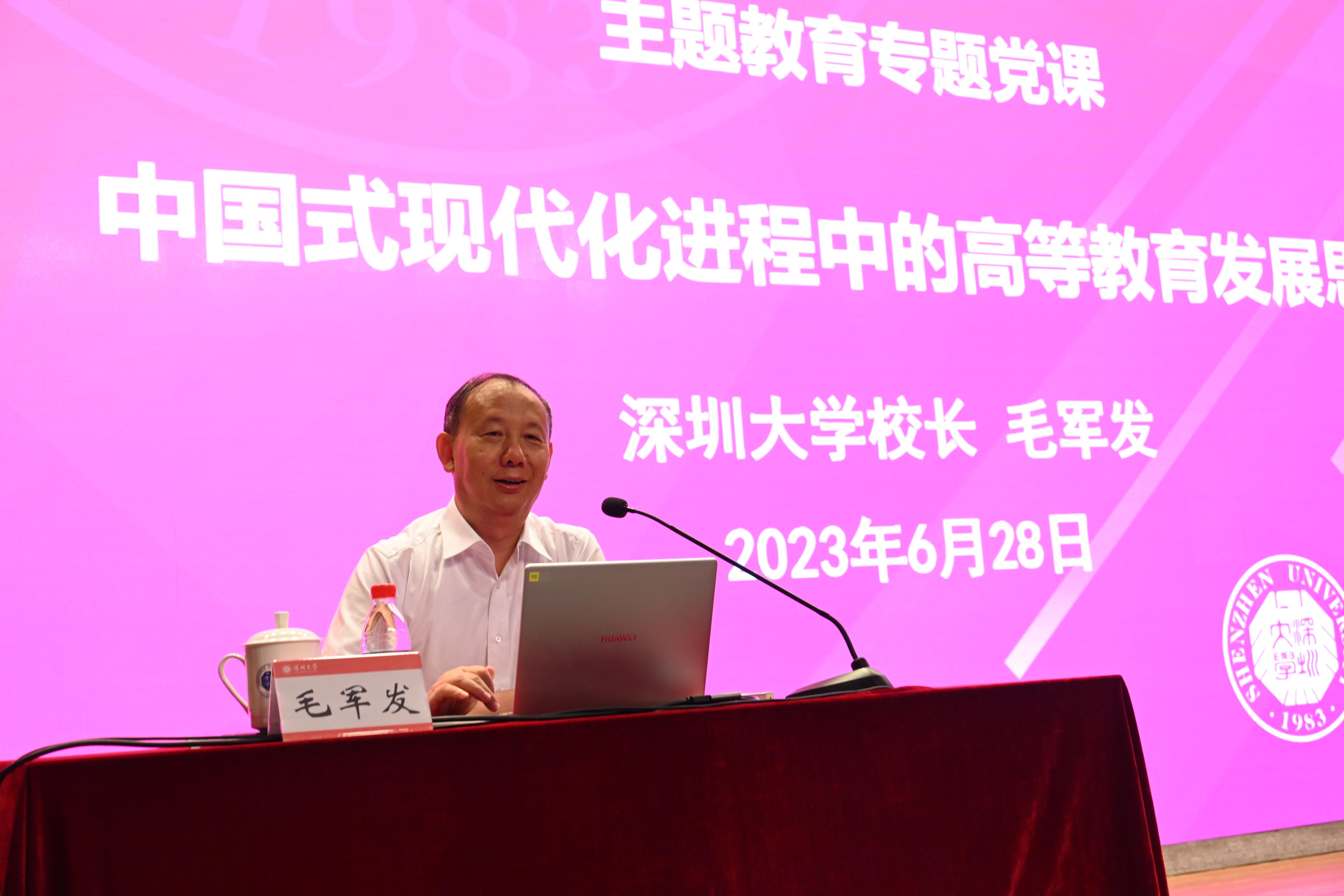 為推動學習貫徹習近平新時代中國特色社會主義思想走深走實,進一步強化理論武裝,6月28日,深圳大學校長毛軍發在匯星樓報告廳為全校領導干部講授專題黨課。全體校領導、全體中層干部、學校主題教育領導小組辦公室全體成員、黨務秘書及黨建組織員現場聆聽并認真學習。