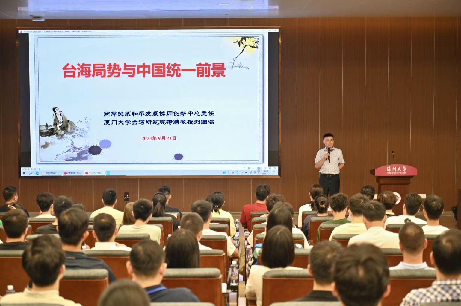 9月21日下午,深圳大學校慶40周年學術系列講座暨“荔園金聲”講堂第三講在深圳大學麗湖校區啟明樓D101開講。廈門大學“閩江學者”特聘教授、兩岸關系和平發展協同創新中心主任劉國深應邀主講“臺海局勢與中國統一前景——新時代黨解決臺灣問題總體方略體會”。