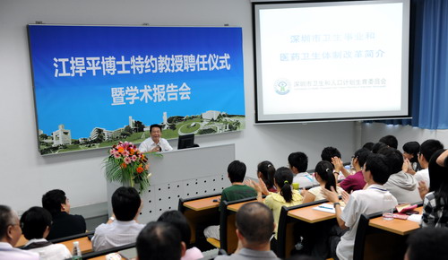 10月25日下午,江捍平博士特約教授聘任儀式暨學(xué)術(shù)報告會在醫(yī)學(xué)院108室舉行。深圳市委衛(wèi)生工委書記,市衛(wèi)生和人口計劃生育委員會黨組書記、主任,深圳大學(xué)醫(yī)學(xué)院學(xué)術(shù)委員會委員江捍平,校長章必功,南山區(qū)人民醫(yī)院院長張德仁,羅湖區(qū)人民醫(yī)院院長葉平,深圳大學(xué)第一附屬醫(yī)院副院長王大平及醫(yī)學(xué)院全體師生參加了聘任儀式。 章必功向江捍平博士頒發(fā)聘書并致辭。他對江博士受聘為我校特約教授表示感謝。他說,...