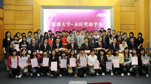 11月29日下午,深圳大學―永旺獎助學金頒發儀式在國際會議廳D廳舉行。日本永旺1%俱樂部委員長原田昭彥,事務局長友村自生,永旺華南商業有限公司董事總經理折口史明,副總經理葉青,行政部總經理佐佐木正博,永旺信貸財務(亞洲)有限公司執行董事?方俊哉,我校副校長李永華,外事處、學生處相關負責人及獲獎學生出席了儀式。 原田昭彥對獲獎學生表示祝賀,并對我校設立這個獎學金表示感謝。他說,獎學金...