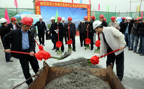 3月18日上午,我校南校區學生公寓主體結構舉行封頂儀式。市建筑工務署副署長倪紹文和市發改局和承建單位建安集團有關負責人及我校領導章必功、陶一桃、阮雙琛、邢鋒、李鳳亮和校辦、財務部、后勤部、基建部、保衛部等部門負責人出席儀式。