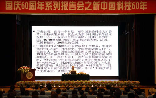 9月14日下午,我校在國際會議廳舉行校黨委理論學習中心組(擴大)會議,中國工程院院士、光電工程學院院長牛憨笨教授在會上作《新中國科技60年》報告,這場報告是我校“國慶60周年”系列報告會的首場。校領導江潭瑜、陶士平、陶一桃、阮雙琛、邢鋒、李鳳亮,校黨委委員,各單位副處以上干部,各基層黨委(總支)委員、紀委委員,各黨支部書記出席會議。報告會由校黨委副書記陶一桃主持。