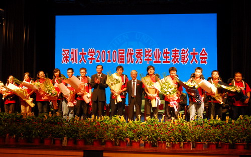荔園七月,碩果滿枝,深圳大學有了自己的博士畢業生!7月1日上午,深圳大學2010屆優秀畢業生表彰大會在國際會議廳舉行。光學工程專業秦琬、信號與信息處理專業李鵬飛兩位博士畢業生和361名優秀畢業生一起從校黨委書記江潭瑜手中接過證書,聆聽校長章必功的畢業致辭,在畢業前夕受到學校的隆重表彰。校領導邢苗、陶士平、陶一桃、阮雙琛、邢鋒、李鳳亮和各學院、研究生部、各機關部處室負責人,教師代表,2010屆優秀本科畢業生和優秀畢業研究生以及部分家長參加典禮。儀式由副校長邢鋒主持。