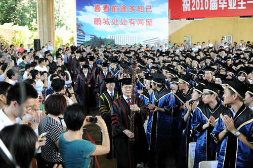 7月2日至4日,三天時間里,深圳大學2010屆本科生畢業典禮暨學位授予儀式在演會中心舉行。校學位評定委員會主席、校長章必功,校學位評定委員會副主席:陶士平、陶一桃、阮雙琛、邢鋒、李永華、李鳳亮和教務處、學生處、招生就業辦等部門負責人,各學院院長、書記、教師代表以及觀禮家長等出席儀式。