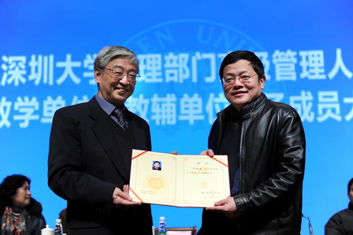 第二,要真抓實干,想干事、干成事。江潭瑜說,新一屆聘期,正是“十二五”規(guī)劃時期,各學院、各部門要結(jié)合學校的整體規(guī)劃提出自己的具體思路和目標,積極籌劃,逐步推進,務(wù)求實效。首先要發(fā)揚改革創(chuàng)新的勇氣和銳氣。要進一步鞏固和深化學校的各項改革措施,包括細化教師分級、高端人才遴選、內(nèi)部管理體制、教學科研管理、后勤管理體制改革和大學條例(章程)立法工作等。其次,要努力提高深圳大學水平。要穩(wěn)步擴大發(fā)展規(guī)模,“十二五”期間招生規(guī)模將達到4萬至4.5萬人,校園基本建設(shè)、基建規(guī)模要加快進度,資源保障要跟上;學科建設(shè)規(guī)模,包括博士點、碩士點、各級重點實驗室等,要進一步拓展;要提高人才培養(yǎng)質(zhì)量,在招生制度、人才培養(yǎng)模式、教學管理、教學方式方法、專業(yè)課程和教材設(shè)置、教學基地建設(shè)、教學質(zhì)量監(jiān)控體系等方面進一步改革創(chuàng)新,全面提升教育教學質(zhì)量;要抓好人才隊伍建設(shè),要堅持引進和培養(yǎng)相結(jié)合,細化高端人才遴選和考核辦法,引進學科領(lǐng)軍人物和高端人才,同時加強中青年教學科研骨干的培養(yǎng),打造一支師德高尚、業(yè)務(wù)優(yōu)良的老師隊伍。
