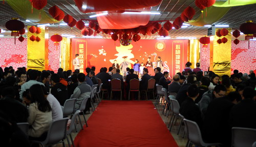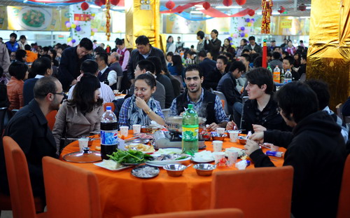 團圓飯在深大新西南餐廳舉行。一副春聯“心隨瑯瑯書聲樂,情系欣欣桃李詩”,道出了荔園美景和師生間的美好情誼;彩色氣球、大紅燈籠和師生們一張張喜氣洋洋的笑臉相互輝映。老師和同學,吃著盆菜、火鍋,唱著歌、跳著舞,一聲聲“新年好!”“新年進步!”說出了心中最美好的祝福。