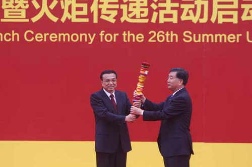 五月的北京,天清氣爽,乍暖還寒。未名湖畔,垂柳依依,春波蕩漾。5月4日上午,深圳第二十六屆世界大學生運動會火炬傳遞活動在北京大學舉行。中共中央政治局常委、國務院副總理李克強,中共中央政治局委員、國務委員劉延東,中共中央政治局委員、廣東省委書記汪洋,教育部部長袁貴仁,廣東省省長黃華華,廣東省委常委、深圳市委書記王榮,深圳市委副書記、市長許勤等在北大百年講堂出席了儀式。我校章必功校長,社會各界知名人士代表成龍、鄧亞萍、白巖松、楊威、譚晶作為嘉賓火炬手與各國大學生代表一道參與了傳遞活動。