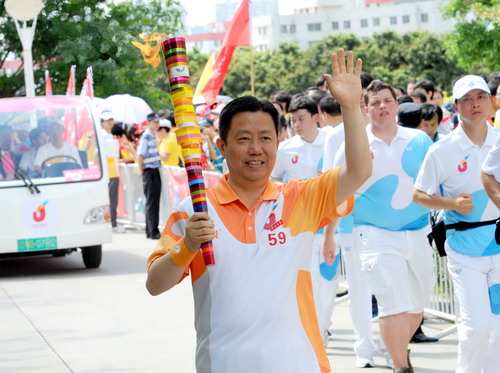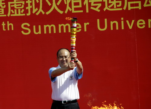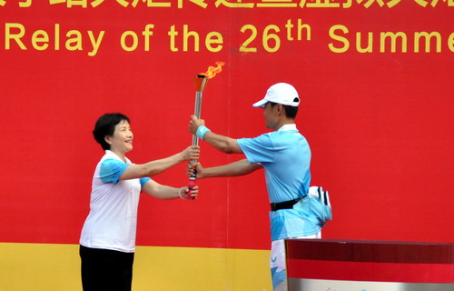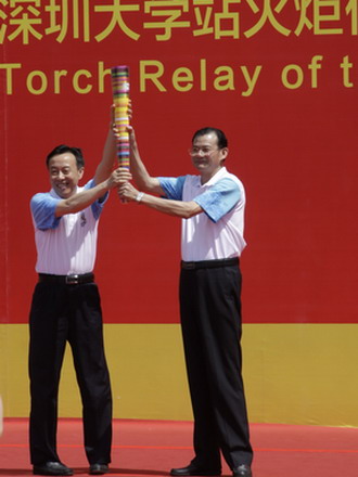 市政協副主席鐘曉渝代表深圳市向深圳大學贈送火炬,校黨委書記江潭瑜代表深圳大學接受深圳市贈送的火炬。第26屆大學生夏季運動會深圳大學站火炬傳遞儀式圓滿結束。5月15日,大運火炬將移師廣州大學城進行傳遞。8月10日、11日將在深圳市區傳遞。