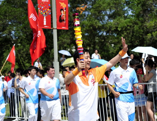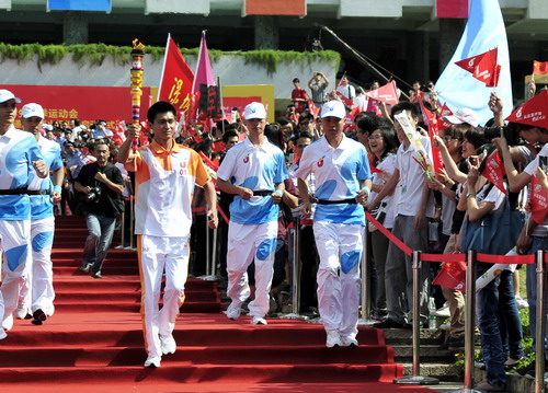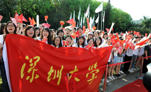 5月10日上午,深圳第26屆世界大學生夏季運動會深圳大學站火炬傳遞暨虛擬火炬傳遞啟動儀式在深圳大學舉行。荔園處處是大運元素的標志,深大、北大深圳研究生院等高校的大學生,高舉“UU”牌、五星紅旗,高喊“從這里開始,不一樣的精彩”,現場一片歡騰。同時,首創的大運會網絡虛擬火炬傳遞正式啟動,將在全國近700所高校進行傳遞。