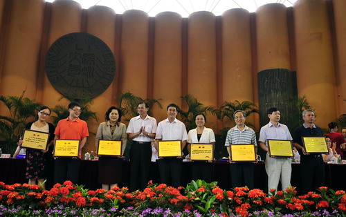 校黨委書記江潭瑜為學術研究貢獻獎和獲得者牛憨笨、邢鋒、何道寬、謝維信、應飛虎、張立川頒獎。