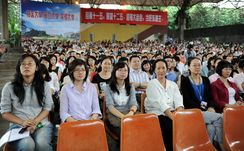 “回顧十一五,展望十二五,迎接大運會,當好東道主”。5月25日下午,我校在演會中心召開全校教職工大會,全面總結“十一五”成績,表彰“十一五”期間教學科研與學科建設領域成績突出個人和集體,布局“十二五”規劃。校領導江潭瑜、章必功、邢苗、陶士平、陶一桃、阮雙琛、邢鋒、李永華參加了大會。