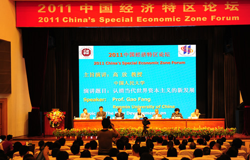 11月5日,由教育部人文社科研究基地――深圳大學中國經濟特區研究中心主辦的2011中國經濟特區論壇――“經濟特區與中國道路”國際學術研討會在我校國際會議廳舉行。教育部社會科學司副司長張東剛,廣東省學位委員會副主任、省教育廳巡視員羅遠芳,吉林大學黨委常務副書記、副校長王勝今,深圳市人民政府副市長吳以環,市委宣傳部副部長、深圳社科院院長吳忠,埃塞俄比亞駐廣州總領事Mr.G.Michael G.Tsadik,我校校長章必功,校黨委副書記、中國經濟特區研究中心主任陶一桃,副校長李鳳亮,來自清華大學、中國人民大學、中山大學、吉林大學、廈門大學、美國麻省理工學院、英國蘇塞克斯大學、日本熊本學園大學等國內外高校和科研機構的著名學者、中外經濟特區和開發區的代表以及深圳大學師生共400余人出席大會。大會由陶一桃主持。