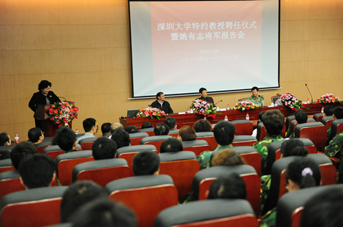 11月28日晚上,深圳大學特約教授聘任儀式暨姚有志將軍報告會在我校南圖書館一樓報告廳舉行。中國軍事科學院戰略研究部部長姚有志少將,深圳市委常委、深圳市警備區政治委員、黨委書記王小毛大校,我校黨委書記江潭瑜、黨委副書記陶一桃和相關部室負責人以及兩百多名深大師生參加報告會。