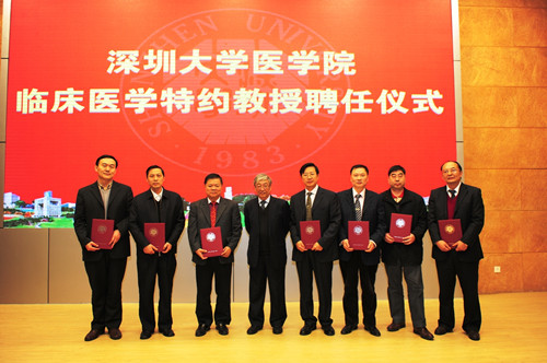 章必功校長為受聘教授頒發聘書并合影留念。章必功感謝深圳醫療界對深大醫學院的關心及支持,并對深圳醫療系統對深大醫學院的認可感到由衷的高興。他說,深大醫學院堅持“小規模、研究型、精英化”的建設原則,進行精英式人才培養,開展超前醫學研究,力求能造就高端教學科研平臺,提供精湛的醫療服務。他希望醫療界與教育界能相互支持,共同發展,為深圳醫療事業貢獻力量。