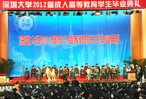 3月24日,深圳大學2012屆成人高等教育學生畢業典禮在演會中心舉行。校學位評定委員會主席、校長章必功,校學位評定委員會副主席、副校長李永華,校學位評定委員會副主席、副校長李鳳亮,各學院主禮教授、各學院機關部室負責人,我校2012屆成人高等教育畢業生以及部分學生家人出席儀式。儀式由李鳳亮主持。這是深大自去年開始第二次為成教畢業生舉行畢業典禮。