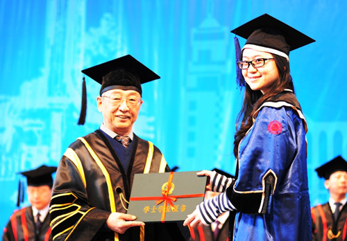 在悠揚的樂曲聲中,章必功、李永華、李鳳亮為參加典禮的畢業生發放畢業證書。