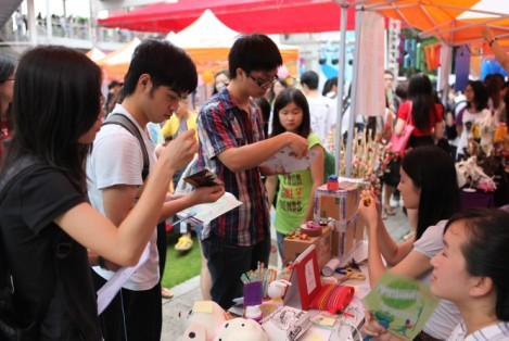 “創意集市”發揮學生特長,突出學生創造性與參與度,以學生創業、創意、創新作品為基礎,通過物物交換、物品拍賣、義賣等交易方式進行。創意集市產品展示、交易分為生活原創類、影視動漫類、工藝美術類和文化創作類四大區域。生活原創區展示和交易青年大學生來源于生活的原創產品,如原創品牌ROARINGWILD自主設計的潮Tee、樂檬Lemon設計創意展示的大學紀念品、Kids-Romance的廢物再利用制作的手工藝品、義工聯項目部手工制作的花等;影視動漫區展示和交易青年大學生原創影視動漫作品,邀請攝影協會和DV協會展示攝影攝像作品,還有 ALFA動漫協會的COSPLAY表演展示等;工藝美術區展示和交易青年大學生原創工藝美術作品,如紙藝布藝、原創明信片等;文化創作區展示和交易青年大學生傳統文化作品,如原創書法、字畫、詩歌、戲劇等。
