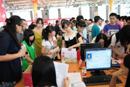 2012年,我校本科面向在全國26個省市自治區招生,除廣東省和面向貧困地區專項招生的省份外,其余省市自治區文理類考生全部在一本線以上錄取。在廣東省共錄取新生5093人;在外省錄取新生1239人;港澳臺地區考生大量報考我校,生源素質較好,最終擇優錄取了300人;免試招收香港學生30人;新疆預科學生轉入135人;此外,為配合深圳市政府推進深圳高等職業教育培養方式改革,試行深圳大學與深圳職業技術學院聯合培養高職本科生,今年首次在廣東省2A分數線上招收了4個專業共234名高職本科生;加上招收的202名本科插班生,我校錄取的本科新生總數達7233人。2012年,隨著我校學科建設的發展,學位點的增加,研究生招生繼續看好。報考攻讀我校碩士學位的人數達12418人,最終錄取1608人(其中學術型研究生1045人,學位研究生563人),錄取人數再創新高,錄取比例為13%。3個一級博士點有123人報考,錄取31人。