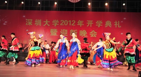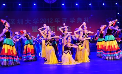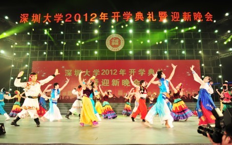 開學典禮結束后,一場異彩紛呈的迎新晚會在這里進行。象征著各民族大團結的舞蹈《大地飛舞》,熱情洋溢,向我們展現了不同民族的風采。榮獲第三屆全國大學生藝術展演二等獎、廣東省第三屆大學生藝術展演一等獎的男生表演唱《say hello》,愉快而輕松,活力四射。傣族舞蹈《水姑娘》調皮可愛,向觀眾展現了傣族姑娘溫柔大方的氣質,讓觀眾如癡如醉。講述了深大學子求職時在理想與現實之間的掙扎,小型舞蹈劇《夢在飛》和當代女子群舞《紅梅花開》演繹了一段滿載濃濃的鄉情、友情和愛情的不同年代的追夢樂章,頗具特色,深受同學們的喜愛。在網絡上迅速走紅的深大學生組合“七朵”,以主打中國風的女子組合表演唱《詠春》,將現場氣氛推到最高潮。胡獨奏《戰馬奔騰》和薩克斯獨奏《龍的傳人》,讓新生們一睹深大教師風采。爵士舞與魔術《風暴》和二踢踏舞《勇往直前》將現場的氣氛再推高潮。女生獨唱《紅紅的日子》用歡快的節奏祝福新同學們在未來生活更加美好。