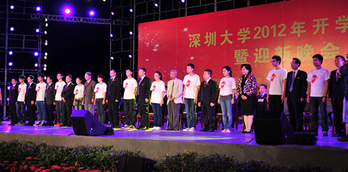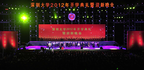 “同學少年、風華正茂,荔園新雨、桃李芬芳”,9月12日晚,2012級新生開學典禮暨迎新晚會在我校體育場舉行。校領導江潭瑜、李清泉、陶士平、陶一桃、阮雙琛、邢鋒、李鳳亮,中國工程院院士牛憨笨,中國科學院院士倪嘉纘,香港余彭年慈善基金會主席、深圳彭年酒店董事長兼總經理余彭年先生的代表彭志兵,正中置業集團董事長、總裁、校友鄧學勤,學校各學院、各機關單位、教研教輔單位的負責人,教師代表、學生家長代表及2012級全體新生出席典禮。