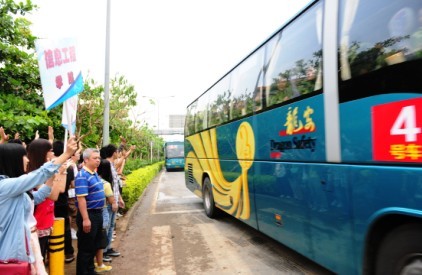 校道上,身著迷彩服的新生們英姿煥發(fā)、裝備整齊,笑容滿面地前往乘車地點集合。各學(xué)院安排了學(xué)生在各大宿舍區(qū)幫助新生提行李,不少師兄師姐還出動電動車義務(wù)接送行李較多的新生。許多新上任的班導(dǎo)都細心地為乘車的新生們準備了早餐、暈車藥、驅(qū)蚊水等物品。上午9點鐘,車隊從各出發(fā)點開拔,一百多輛大型巴士在寬闊的馬路上擺起長龍,在激揚的軍樂聲中浩浩蕩蕩開往軍訓(xùn)基地。