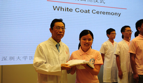 鐘南山為臨床醫學專業2012級新生授白袍。新生在姜文奇院長的帶領下莊嚴宣誓,決心為祖國醫藥衛生事業的發展和人類身心健康奮斗終身。