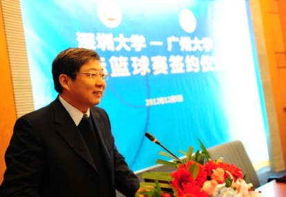 李清泉致歡迎辭,感謝廣州大學對深大開展校際體育比賽計劃的積極響應。他表示,明年是深圳大學建校30周年,學校確立了建設高水平、有特色、現代化一流大學的目標,并且把加強與國內外高校的交流與合作,建設開放生動、積極進取、朝氣蓬勃、充滿活力的校園文化,列為近期重點工作之一。深圳大學將大力支持、積極組織各種體育活動,特別是與香港、廣州、深圳等地高校之間的校際體育競技活動。他說:“體育運動是大學教育的重要內容,是校園文化的重要組成部分。通過體育運動可以活躍校園文化氛圍,培養學生的身心健康,而這次校際間的體育賽事能夠促進深圳大學與廣州大學加強合作、加深理解,希望通過體育方面的交流上升到高校之間甚至是兩座城市之間的合作?!?BR> 庾建設致辭。他認為這次的校際籃球賽不僅是兩大高校之間文化交流的大事,更是兩座城市開展合作工作的大事。深圳大學和廣州大學都是以城市來命名的學校,一直以來,深大注重與國內外高校的合作交流,校園文化開放生動、充滿活力。而廣州大學立足于歷史文化名城廣州,推進內涵發展、特色發展、開放發展、和諧發展。兩所高校共同打造校際籃球賽的平臺,展現了兩校的激情與活力,希望今后以體育賽事為契機,促進兩校深化合作、共同發展。