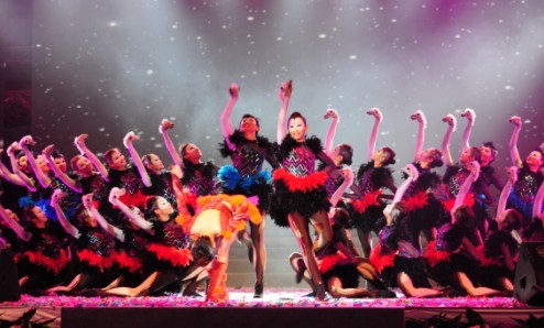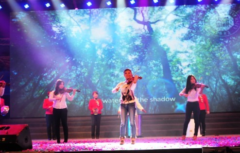 熱辣舞蹈,盡情演唱的委內(nèi)瑞拉籍留學(xué)生真美樂傳來海外祝福,異域風(fēng)情盡顯。一曲唱罷,身穿唐裝的老師與真美樂及其中國朋友同臺獻(xiàn)唱一曲新年祝曲,臺上秧歌舞動(dòng),中外文化異常融洽。空靈笛聲悠悠響起,漂亮帥氣的模特們緩緩走上舞臺,時(shí)尚與古典碰撞,視覺與聽覺共振,在《宇宙空靈》里,今古文化完美融合。其中,博得滿堂紅的節(jié)目莫過于由后勤部與保衛(wèi)部帶來的《時(shí)代的節(jié)奏》。學(xué)生們手持小提琴,緩緩奏出天籟,后勤部飯?zhí)玫氖迨灏⒁逃檬埖拇箬F桶、鍋蓋、盆子等伴奏,保衛(wèi)部的小伙子排成4列,站在觀眾席走道上隨著音樂起舞。現(xiàn)場尖叫迭起,掌聲與歡笑雷動(dòng),為這一“和諧”的表演驚嘆喝彩。最為文藝而有感染力的節(jié)目當(dāng)屬由校友花晶晶、陳金龍編導(dǎo)的,由深圳中學(xué)舞蹈團(tuán)帶來的《小小小小鳥》。模擬鴕鳥穿著的表演者們,以手臂化作鴕鳥脖頸,以手指拳頭模仿鴕鳥頭,背彎下,如一群鴕鳥一般“竄上”舞臺,霎時(shí)驚艷了觀眾的眼。時(shí)而兩只“鳥兒”在聚光燈下嬉戲玩耍、竊竊私語,時(shí)而一群鳥兒如遇驚弓之箭,驚恐不安,四下飛散。忽然音樂緩起,《我是一只小小鳥》傳達(dá)出愈張飛無奈關(guān)羽的惆悵,一只“鳥兒”匍匐地上,萎靡不振,掙扎、不甘之情牽動(dòng)了觀眾神經(jīng)。直至臺上燈光暗下,大家才如夢初醒般齊喝彩。