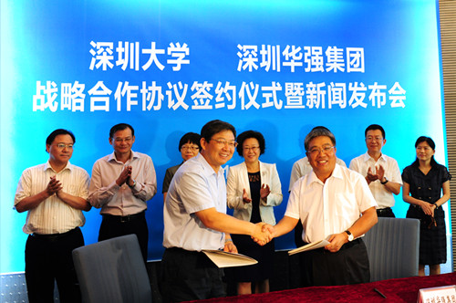 根據(jù)協(xié)議,深圳華強(qiáng)集團(tuán)計(jì)劃投入1.5億元人民幣,用于支持我校建設(shè)高水平、有特色、現(xiàn)代化的一流大學(xué),合作內(nèi)容包括:華強(qiáng)集團(tuán)捐贈(zèng)5000萬元人民幣,資助我校學(xué)科建設(shè)、科學(xué)研究,引進(jìn)高層次人才、獎(jiǎng)勵(lì)優(yōu)秀學(xué)生等;以及華強(qiáng)集團(tuán)人才培養(yǎng)提供教學(xué)場(chǎng)地、課程設(shè)計(jì)、培訓(xùn)進(jìn)修等方面的教學(xué)服務(wù)。華強(qiáng)集團(tuán)出資人民幣1億元或以上,用于雙方合作投資建設(shè)具有國(guó)際水準(zhǔn)和影響力的深大華強(qiáng)商學(xué)院。深圳大學(xué)科學(xué)實(shí)驗(yàn)室向深圳華強(qiáng)集團(tuán)開放,雙方共同申報(bào)各類科研項(xiàng)目,合作開展科學(xué)研究和技術(shù)開發(fā),共享科研成果;我校的科研技術(shù)成果同等條件下優(yōu)先在深圳華強(qiáng)集團(tuán)企業(yè)進(jìn)行轉(zhuǎn)化應(yīng)用。我校根據(jù)深圳華強(qiáng)集團(tuán)的需要,提供訂單式專門人才培養(yǎng);在深圳華強(qiáng)集團(tuán)設(shè)立實(shí)踐基地,推薦優(yōu)秀學(xué)生到深圳華強(qiáng)集團(tuán)企業(yè)實(shí)習(xí)和就業(yè)。我校聘請(qǐng)深圳華強(qiáng)集團(tuán)為董事會(huì)董事單位,聘請(qǐng)梁光偉先生為深圳大學(xué)教育發(fā)展基金會(huì)名譽(yù)理事。